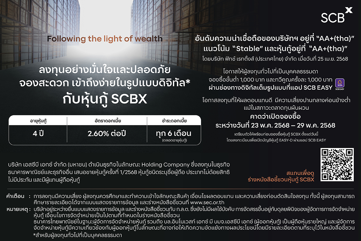 กรุงเทพฯ, 30 เมษายน 2568 - บริษัท เอสซีบี เอกซ์ จำกัด (มหาชน) หรือ SCBX กลุ่มธุรกิจเทคโนโลยีทางการเงินชั้นนำของไทย เตรียมเสนอขายหุ้นกู้ครั้งที่ 1/2568 ให้แก่ประชาชนเป็นการทั่วไป เพื่อเป็นทางเลือกในการลงทุนที่มั่นคง ปลอดภัย ในช่วงเวลาที่ตลาดการเงินโลกเผชิญกับความไม่แน่นอนและความผันผวนทางเศรษฐกิจที่รุนแรง โดยหุ้นกู้ที่เสนอขายเป็นหุ้นกู้ชนิดระบุชื่อผู้ถือ ประเภทไม่ด้อยสิทธิ ไม่มีประกัน และมีผู้แทนผู้ถือหุ้นกู้ อายุ 4 ปี อัตราดอกเบี้ยคงที่ 2.60% ต่อปี กำหนดจ่ายดอกเบี้ยทุก 6 เดือน ตลอดอายุหุ้นกู้ จองซื้อขั้นต่ำ 1,000 บาท ทวีคูณครั้งละ 1,000 บาท ทั้งนี้ หุ้นกู้ได้รับการจัดอันดับเครดิตที่ 'AA+(tha)' พร้อมแนวโน้ม 'Stable' โดยบริษัท ฟิทช์ เรทติ้งส์ (ประเทศไทย) จำกัด เมื่อวันที่ 25 เมษายน 2568 ซึ่งเป็นอันดับความน่าเชื่อถือที่สะท้อนความแข็งแกร่งด้านฐานะการเงิน การบริหารความเสี่ยงที่รอบคอบ และศักยภาพการเติบโตที่มั่นคงในระยะยาว โดยคาดว่าจะเปิดจองซื้อระหว่างวันที่ 23-29 พฤษภาคม 2568 ผ่านช่องทางดิจิทัลเต็มรูปแบบ