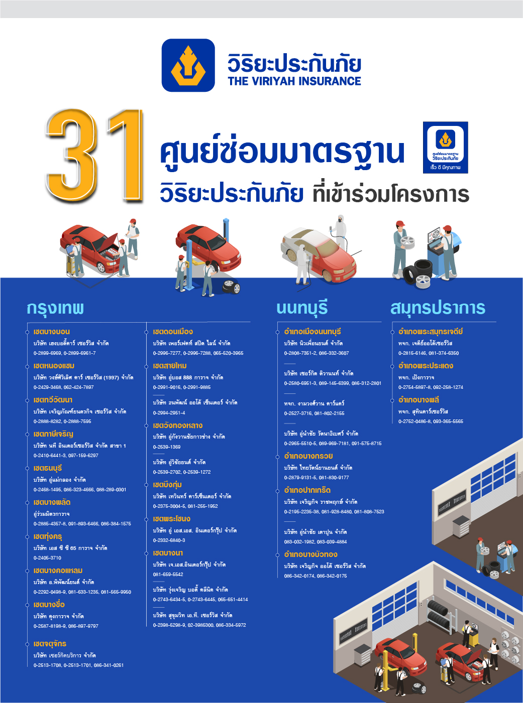 สำหรับศูนย์ซ่อมมาตรฐานวิริยะประกันภัยที่เข้าร่วมโครงการให้บริการตรวจรถฟรี จำนวน 31 แห่ง ได้แก่ 1) อู่ร่วมมิตรการาจ 2) บจ.นิวเพื่อนยนต์ 3) บจ.ไทยรัตน์ยานยนต์ 4) หจก. งามวงศ์วาน คาร์แคร์ 5) บจ.อู่นำชัย รัตนาธิเบศร์ 6) บจ.เซอร์กิต ติวานนท์ 7) บจ.อู่นำชัย เตาปูน (สาขาติวานนท์) 8) บจ.เจริญกิจ ราชพฤกษ์ 9) บจ.เจริญกิจ ออโต้ เซอร์วิส 10) บจ. คุงการาจ 11) บจ.เซอร์กิตบริการ 12) บจ.อู่กังวานชัยการช่าง 13) บจ.อู่วิชัยยนต์ 14) บจ.เทวินทร์ คาร์เซ็นเตอร์ 15) อู่บอส 888 การาจ 16) บจ.ธนพัฒน์ ออโต้ เซ็นเตอร์ 17) บจ.เพอร์เฟคท์ สปีด ไลน์ 18) บจ.เอส ซี ซี 65 การาจ 19) หจก. เจดีย์ออโต้เซอร์วิส 20) หจก.เป้งการาจ 21) บจ. อู่ เอส.เอส. อินเตอร์กรุ๊ป 22) บจ.รุ่งเจริญ บอดี้ คลีนิค 23) บจ.สุขุมวิท เอ.ที. เซอร์วิส 24) หจก.สุทินคาร์เซอร์วิส 25) บจ.เฮงบอดี้คาร์ เซอร์วิส 26) บจ.เฮงบอดี้คาร์ เซอร์วิส 27) บจ.วงษ์ศิริเลิศ คาร์ เซอร์วิส (1997) 28) บจ.เจริญภัณฑ์ยนตรกิจ เซอร์วิส 29) บจ.นที อินเตอร์เซอร์วิส สาขา 1 30) บจ.อู่แม่กลอง 31) บจ.อ.พิพัฒน์ยนต์ (1989)