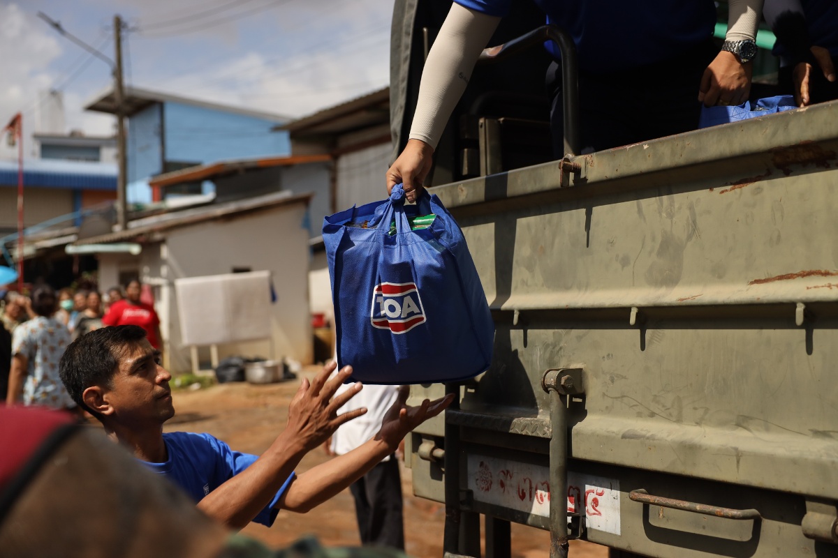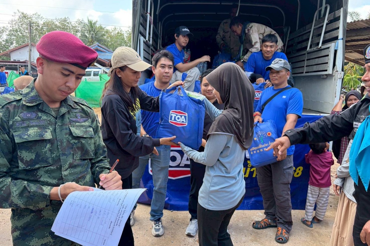 นายประจักษ์ ตั้งคารวคุณ ประธานผู้ก่อตั้ง TOA เผยว่า จากความเสียหายอย่างหนักที่เกิดจากอุทกภัยครั้งใหญ่ในภาคใต้ ซึ่งส่งผลกระทบต่อชีวิตความเป็นอยู่ของพี่น้องประชาชน และระบบสาธารณสุขโดยตรง เราจึงมีความห่วงใยและเข้าใจถึงความยากลำบากที่ทุกคนกำลังเผชิญ จึงพร้อมเป็นส่วนหนึ่งในการสนับสนุน ช่วยเหลือ เยียวยา และฟื้นฟูผู้ประสบอุทกภัยอย่างต่อเนื่องหลังสถานการณ์น้ำท่วมคลี่คลายลง เดินหน้า โครงการ TOA ไม่ทิ้งกัน "รวมพลังไทย ฟื้นฟูน้ำท่วมภาคใต้" ตั้งแต่การลงพื้นที่ช่วยเหลือเยียวยาพี่น้องประชาชนชาวใต้ ในการระดมทีม ‘ทีโอเอ อาสา’ ร่วมกับกำลังทหาร (กอ.รมอ.ภาค 4 ส่วนหน้า, กองทัพภาคที่ 4, มณฑลทหารบกที่ 42) ส่งมอบถุงยังชีพกว่า 2,000 ชุด ประกอบด้วย ข้าวสาร บะหมี่กึ่งสำเร็จรูป ปลากระป๋อง ถั่วมารูโจ้ น้ำยาทำความสะอาดทีโพล์ และสเปรย์กำจัดแมลงเชนไดร้ท์ รวมทั้งสิ่งของบรรเทาทุกข์ ผ้าห่มกันหนาว เสื้อยืด น้ำดื่ม และชุดผลิตภัณฑ์ทำความสะอาดทีโพล์ แจกจ่ายให้แก่ประชาชนในพื้นที่ชุมชนต่างๆ ที่ได้รับผลกระทบอย่างทั่วถึง อาทิ ชุมชนบ้านกลางนา ชุมชนอู่ ทส. ชุมชนจันทร์วิโรจน์ ชุมชนบางแฟ้บ ชุมชนบ้านพักรถไฟ ชุมชนศิครินทร์ และชุมชนรายย่อยอื่นๆ รวมทั้งในพื้นที่จังหวัดยะลา และปัตตานี เพื่อเร่งเยียวยา ให้ความช่วยเหลือเข้าถึงทุกคนอย่างทั่วถึงและรวดเร็วที่สุด