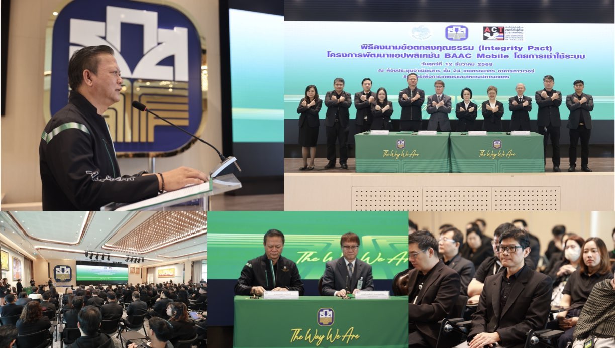 นายทองคำ เกตุโชติ รองผู้จัดการธนาคารเพื่อการเกษตรและสหกรณ์การเกษตร (ธ.ก.ส.) ร่วมลงนามข้อตกลงคุณธรรม “โครงการพัฒนาแอปพลิเคชัน BAAC Mobile โดยการเช่าใช้ระบบ” ระหว่าง ธ.ก.ส. กรมบัญชีกลาง และองค์กรต่อด้านคอร์รัปชัน (ประเทศไทย) เพื่อพัฒนาและยกระดับแอปพลิเคชัน BAAC Mobile รูปแบบใหม่ภายใต้มาตรฐานที่สูงยิ่งขึ้น ทั้งด้านเทคโนโลยี และความปลอดภัย รวมถึงดำเนินโครงการภายใต้ข้อตกลงคุณธรรม (Integrity Pact) เพื่อช่วยให้กระบวนการจัดซื้อจัดจ้างเป็นไปด้วยความโปร่งใสและเป็นระบบซึ่งมี ผู้สังเกตการณ์อิสระติดตามตรวจสอบตั้งแต่เริ่มต้นจนสิ้นสุดขั้นตอน ซึ่งช่วยเสริมความน่าเชื่อถือ และสะท้อนว่าธนาคารดำเนินงานบนหลักธรรมาภิบาลอย่างแท้จริง ข้อตกลงดังกล่าวจึงเป็นกลไกสำคัญที่สนับสนุนความสำเร็จของโครงการขนาดใหญ่ และช่วยให้การใช้ทรัพยากรของรัฐเกิดประโยชน์สูงสุด ซึ่งนับเป็นอีกหนึ่งก้าวสำคัญของ ธ.ก.ส. ในการขับเคลื่อนพันธกิจของธนาคารในการเป็นศูนย์กลางทางการเงินที่ให้บริการครบวงจรและทันสมัย ตอบโจทย์การใช้งานของเกษตรกร ลูกค้าและประชาชนผู้ใช้บริการทั่วประเทศได้อย่างมั่นคงและมีประสิทธิภาพในทุกมิติ โดยมีคณะผู้บริหาร พนักงาน และส่วนงานที่เกี่ยวข้อง เข้าร่วมกิจกรรม ณ ห้องประชุมจำเนียรสาร ชั้น 24 เกษตรธนากร อาคารทาวเวอร์ เมื่อวันที่ 12 ธันวาคม 2568