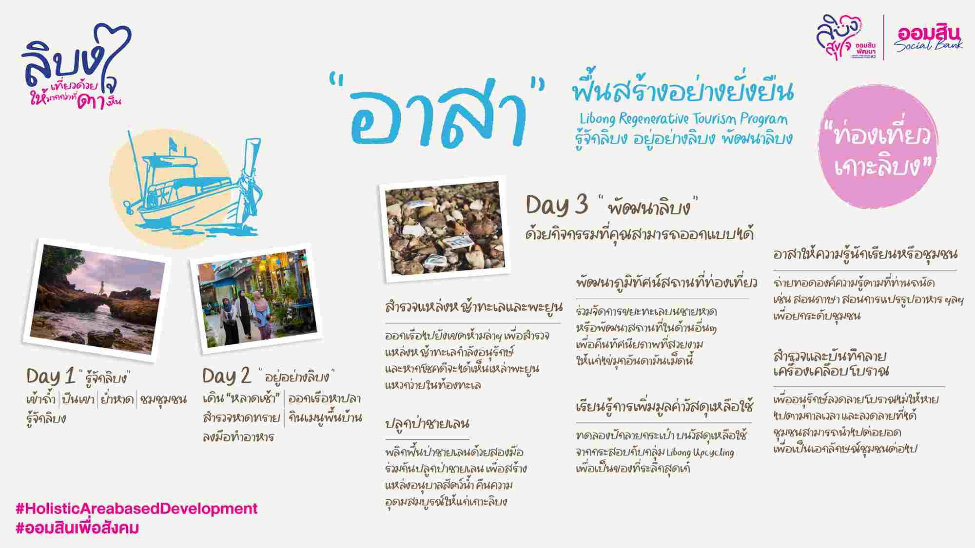 “Meaningful Travel” – ลิบง เที่ยวด้วยใจ ให้มากกว่าที่ตาเห็น เป็นแคมเปญส่งเสริมการท่องเที่ยว ภายใต้โครงการ “ลิบงสุขใจ ออมสินพัฒนา” ที่วางเป้าหมายการพัฒนาครอบคลุมทุกมิติ โดยยกระดับผ่าน การท่องเที่ยวแบบชุมชน และ การส่งเสริมอาชีพ/สร้างรายได้ ทั้งในรูปแบบของการจัดทำเส้นทางการท่องเที่ยวผ่าน E-Book ยกระดับกิจการโฮมสเตย์ให้มีมาตรฐาน และสร้างผู้นำเที่ยวชุมชนโดยให้เยาวชนเป็นผู้ถ่ายทอดเรื่องราว (Storytelling) ตลอดจนยกระดับผลิตภัณฑ์และภูมิปัญญาท้องถิ่น และส่งเสริมการตลาดของกลุ่มอาชีพ ศึกษารายละเอียดเพิ่มเติมเกี่ยวกับเส้นทางท่องเที่ยวเกาะลิบงได้ที่เฟซบุ๊กเพจ GSB Society