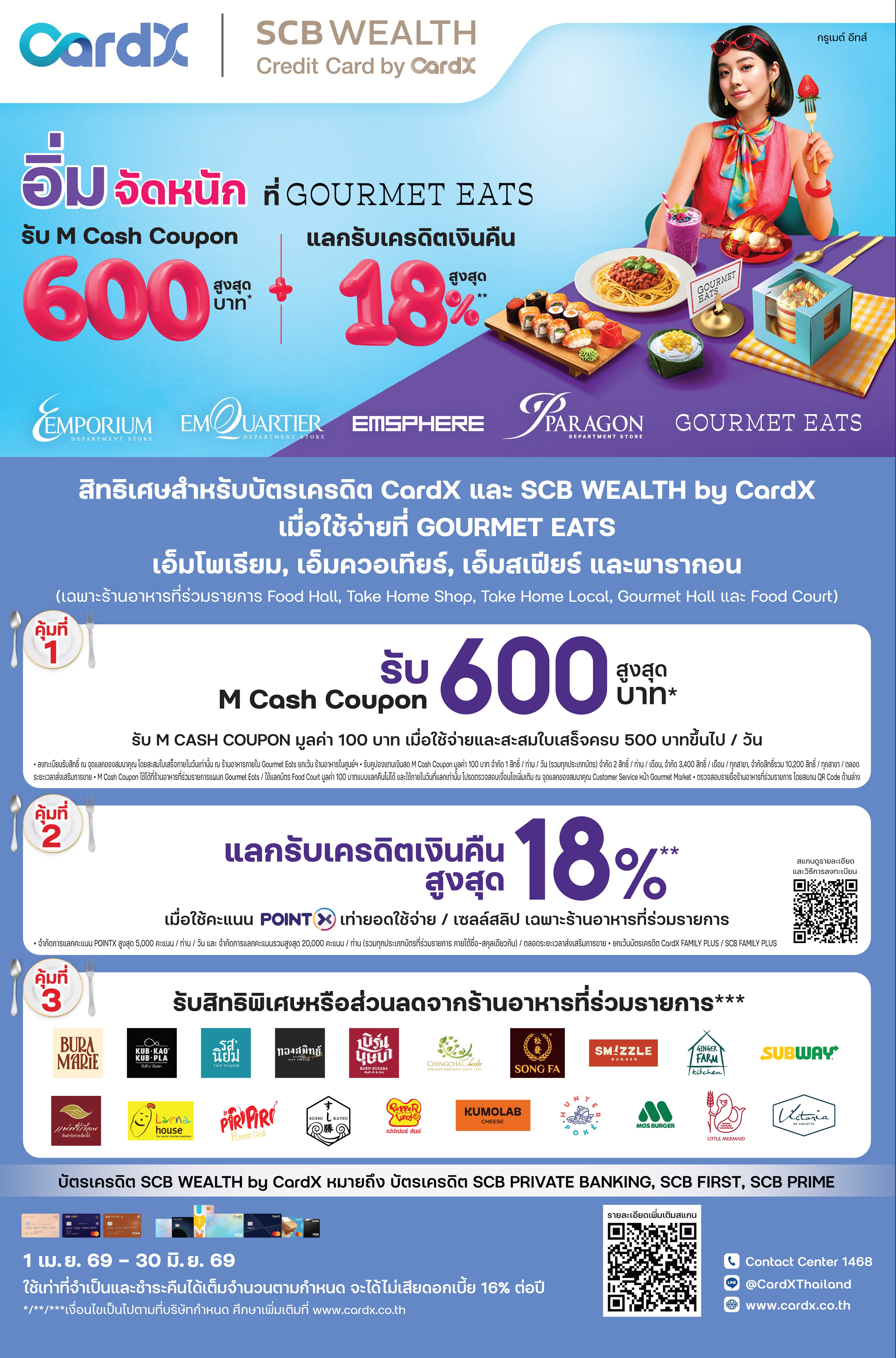 สำหรับแคมเปญ อิ่มจัดหนัก ที่กูร์เมต์ อีทส์ ลูกค้าผู้ถือบัตรเครดิต CardX และ SCB WEALTH by CardX สามารถรับสิทธิประโยชน์ได้ 3 ต่อ