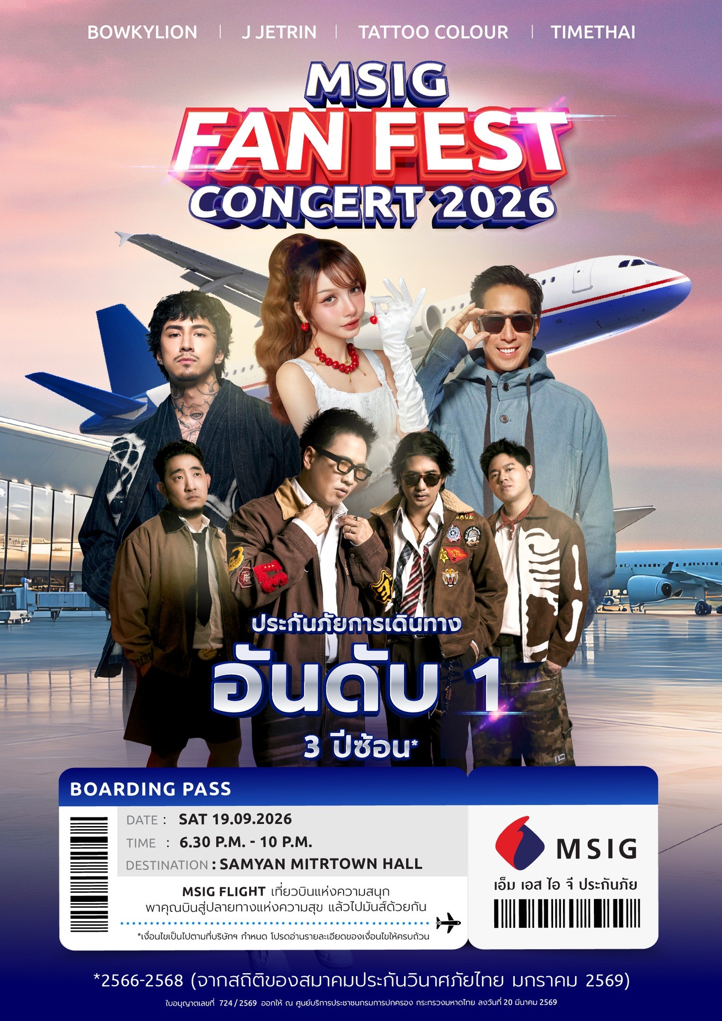เพื่อขอบคุณและตอบแทนลูกค้าที่ให้ความไว้วางใจกว่า 10 ปีในผลิตภัณฑ์ประกันภัยเดินทางต่างประเทศของบริษัท MSIG เตรียมจัดคอนเสิร์ตใหญ่ “MSIG Fan Fest 2026” พร้อมมอบสิทธิพิเศษสำหรับผู้ที่ซื้อประกันภัยการเดินทาง MSIG Travel Easy Plus ระหว่างวันที่ 1 เมษายน – 30 มิถุนายน 2569 ดังนี้